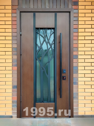 Термодверь МДФ шпон (окрас RAL) с кованой решеткой и стальным декором