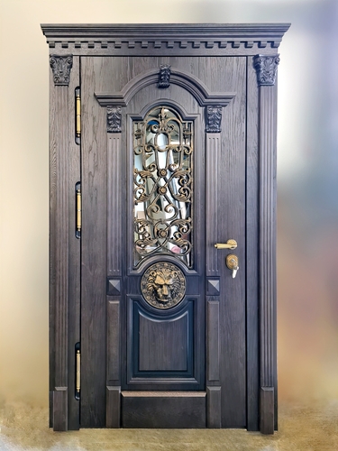 Дверь с массивом, ковкой и стеклом, резьбой, карнизом